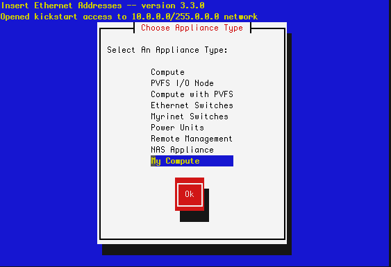 Select My Compute then hit Ok. This removes compute-0-0 from the database and the next node that asks to be configured (that is, the next node that sends out a DHCP request) will be assigned the name my-compute-0-0. To see this in action, instruct compute-0-0 to reinstall itself: