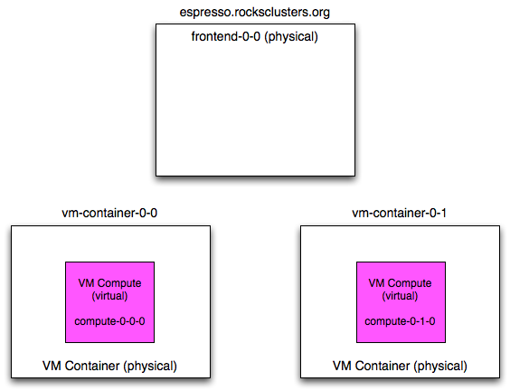 In the above picture, "frontend-0-0" is a physical machine (with the public name of "espresso.rocksclusters.org". The physical machine "frontend-0-0" controls two VM compute nodes named "compute-0-0-0" and "compute-0-1-0". This means that "compute-0-0-0" and "compute-0-1-0" are configured by "frontend-0-0". This is opposed to the "virtual cluster scenario" (Installing Virtual Clusters), where the virtual frontend ("frontend-0-0-0") configured the VM compute nodes, and the physical machine that housed "frontend-0-0-0" only started and stopped the virtual compute nodes.